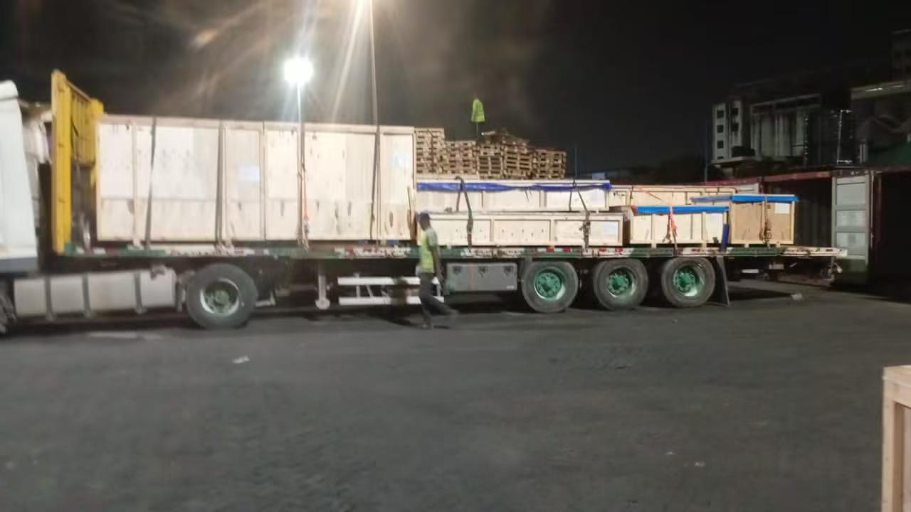 Vid varornas ankomst till Tema Port, Ghana, vår professionellt team slutförde mottagning och inspektion snabbt. För stor effekt utrustning genomförde vi full-process surrning och förstärkning för att förhindra förskjutning under landtransport. Alla varor var helt täckta med vattentäta laminerade presenningar för att motstå hårt väder och fuktskador. Varje transportfordon var utrustad med en standardkvittoblankett för spårbarhet och verifiering av hela processen.
